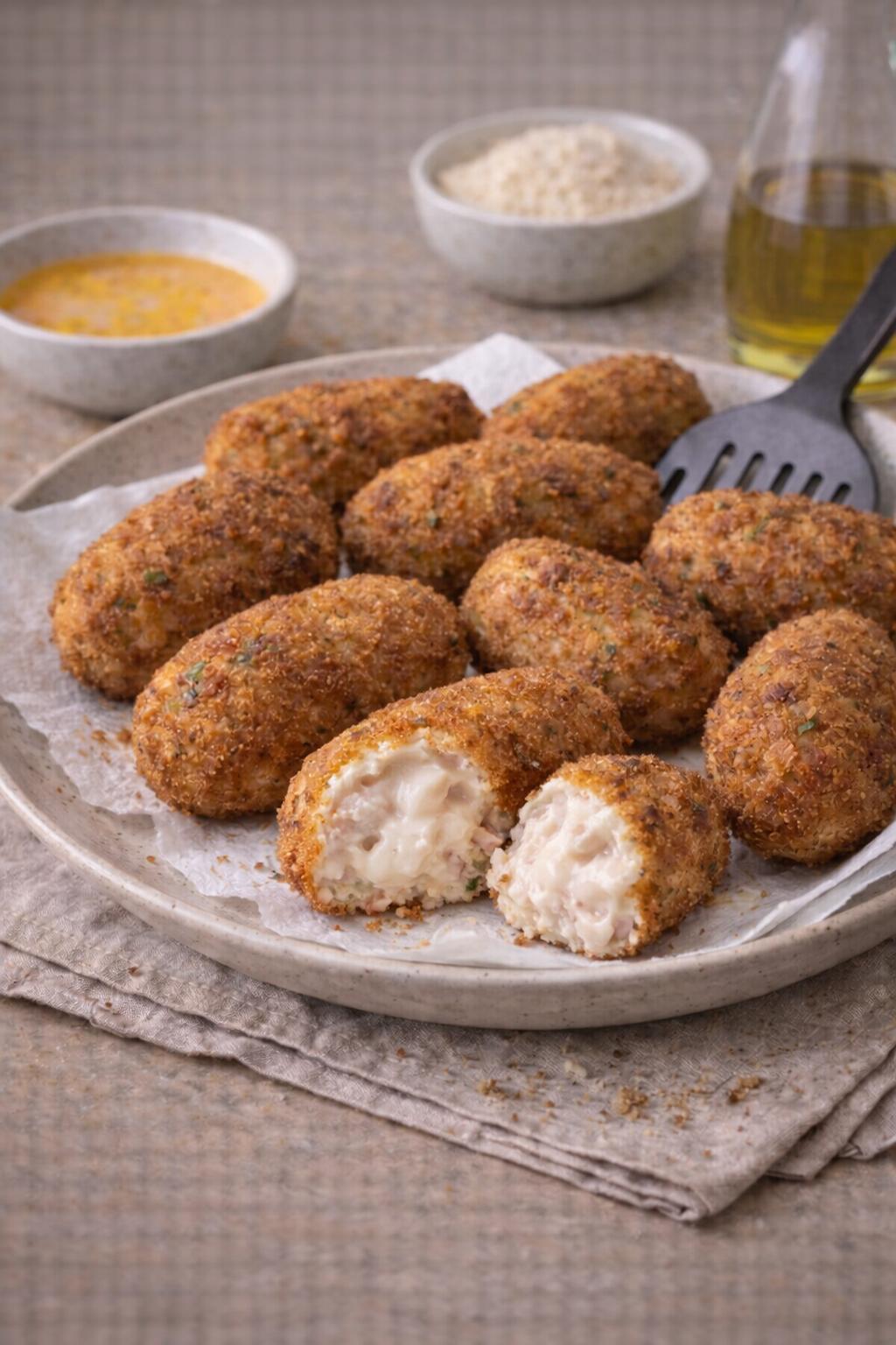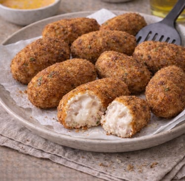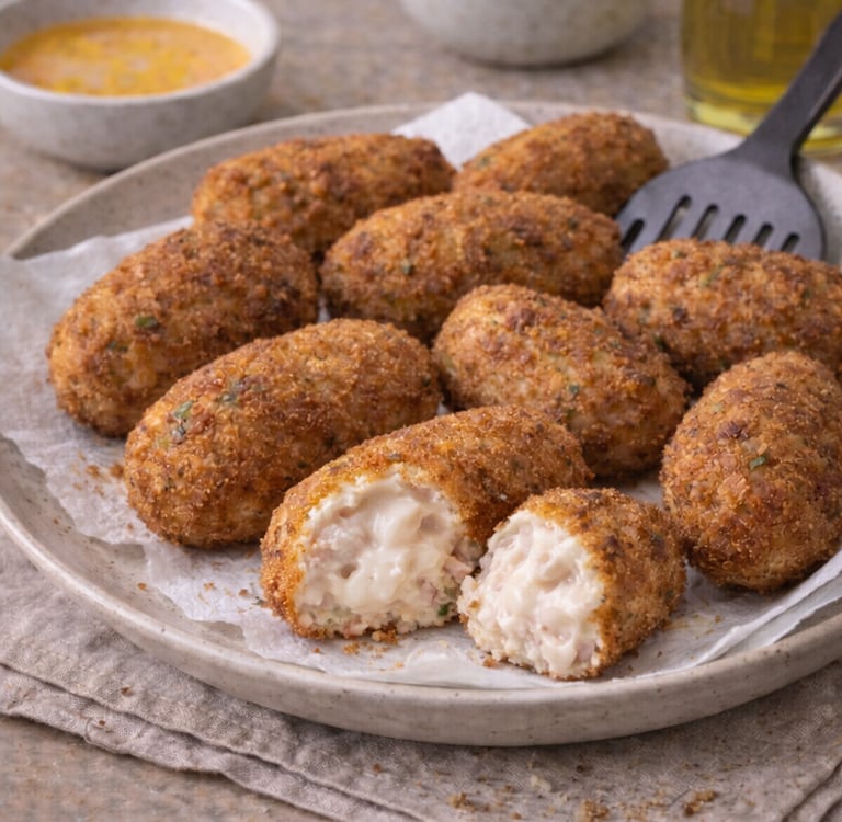 J’ai mangé ces croquettes toute ma jeunesse. Elles font partie de ces plats que l’on retrouve toujours dans les cuisines familiales espagnoles, prêtes à être sorties du congélateur pour un repas improvisé. On peut les décliner à l’infini : jambon seul, poulet seul, poisson, fromage ou légumes. Mais pour moi, celles au poulet et au jambon resteront toujours les meilleures.