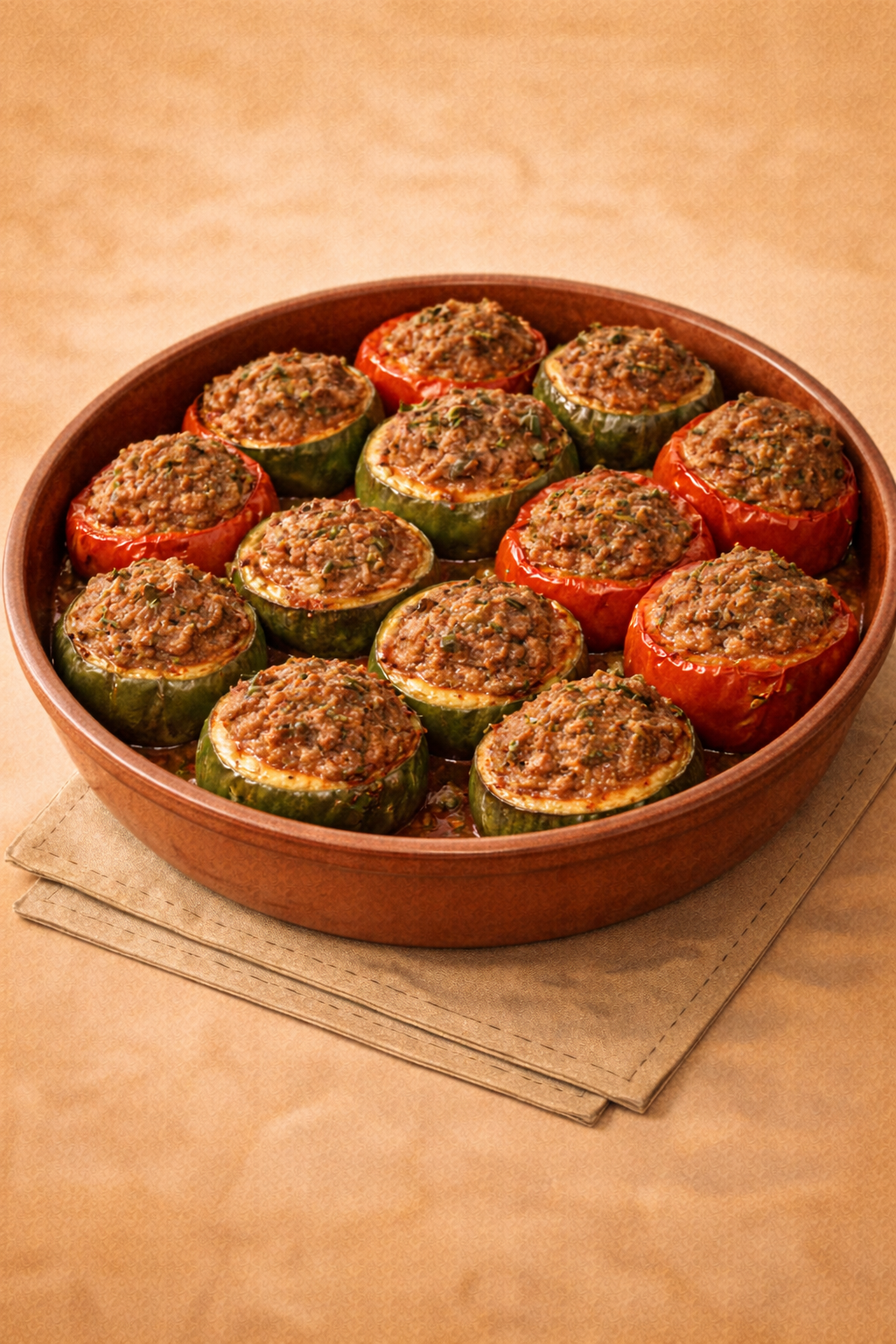Couper les légumes et les évider, puis les remplir avec la farce. Déposer dans le plat.