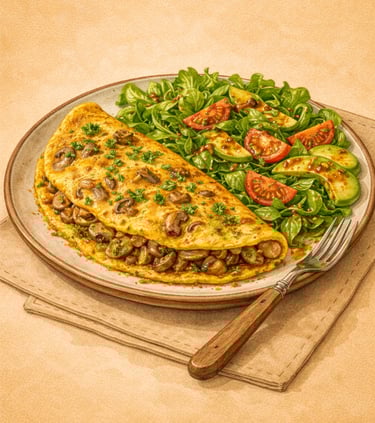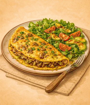 Omelette aux champignons et salade à la sauce secrète – Hugo