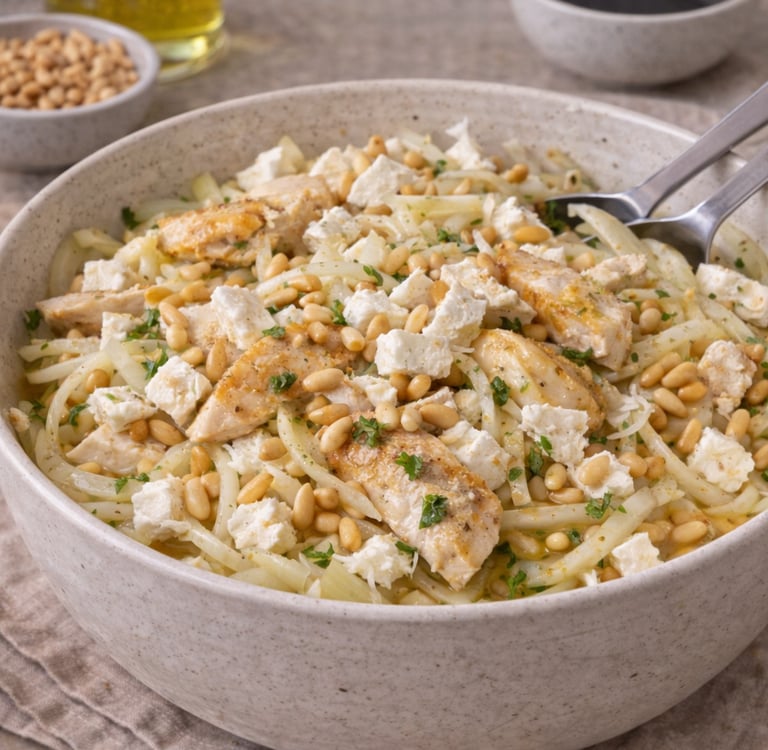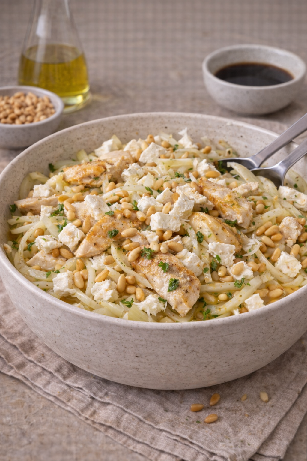 Ajouter au fenouil le poulet chaud, les pignons de pin et la feta émiettée.